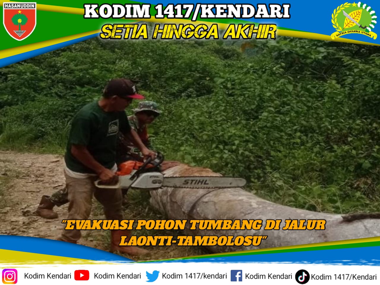 Dengan menggunakan gergaji mesin, ia bahu-membahu bersama warga memotong batang pohon yang melintang di tengah jalan penghubung Laonti-Tambolosu demi memastikan mobilitas masyarakat tidak terputus.