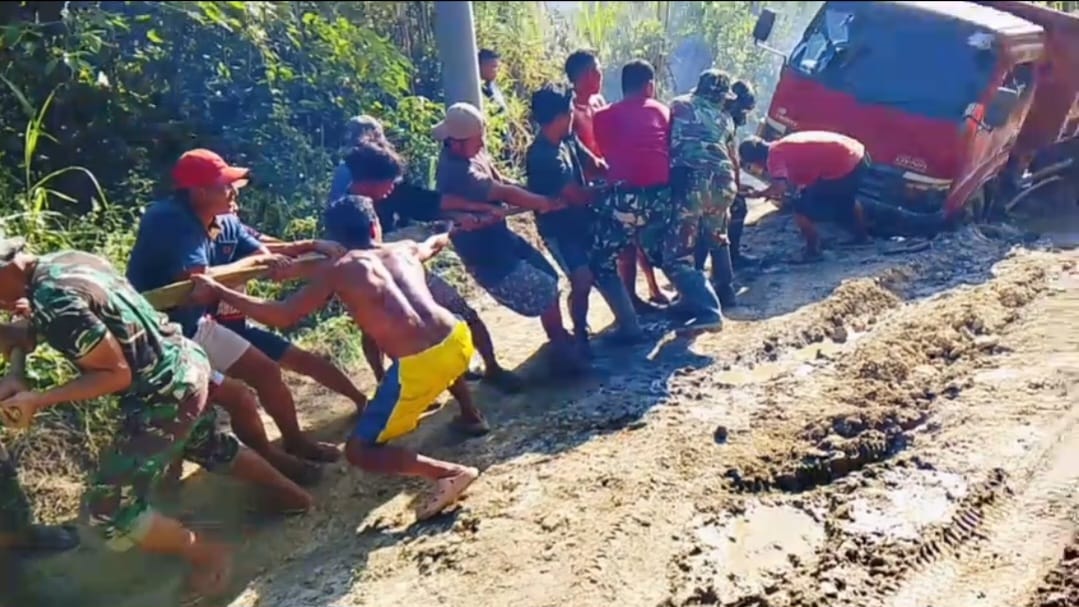 Kejadian tersebut terjadi saat kendaraan yang mengangkut bahan material berupa kayu untuk pembangunan sasaran fisik TMMD melintas di jalur yang licin akibat hujan. Melihat kondisi itu, anggota Satgas bersama warga sekitar dengan sigap bahu membahu mengevakuasi mobil agar bisa kembali melanjutkan perjalanan.