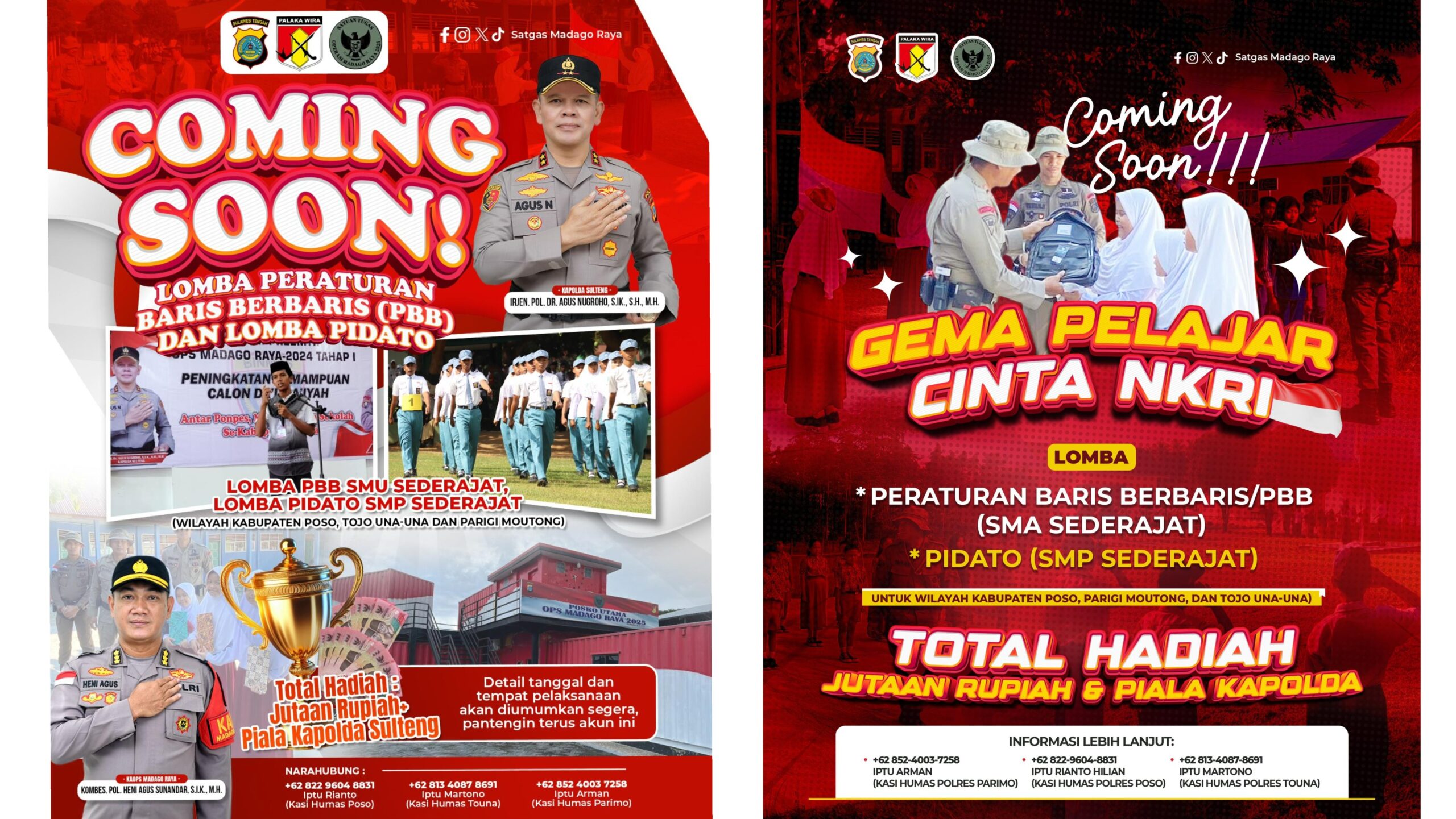 Poso, fokustime.id– Satgas Madago Raya kembali menghadirkan kegiatan positif bagi generasi muda Sulawesi Tengah. Kali ini, melalui ajang bertajuk “Gema Pelajar Cinta NKRI”, Satgas Madago Raya bakal menggelar lomba Peraturan Baris Berbaris (PBB) dan pidato yang memperebutkan total hadiah jutaan rupiah serta Piala Kapolda Sulteng.