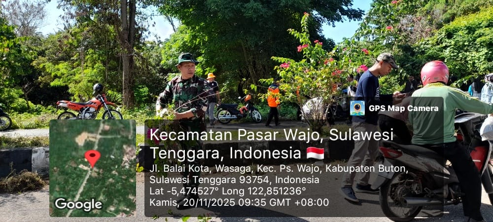 Buton, fokustime.id– Personel Babinsa Koramil 1413-02/Pasarwajo yang di pimpin Pelda Rahman Hamiru bersama masyarakat menggelar kerja bakti membersihkan badan jalan dan saluran air di sepanjang jalan poros Pasarwajo–Lasalimu, Kelurahan Wasaga, Kecamatan Pasarwajo, Kabupaten Buton, pada Kamis (20/11/2025).