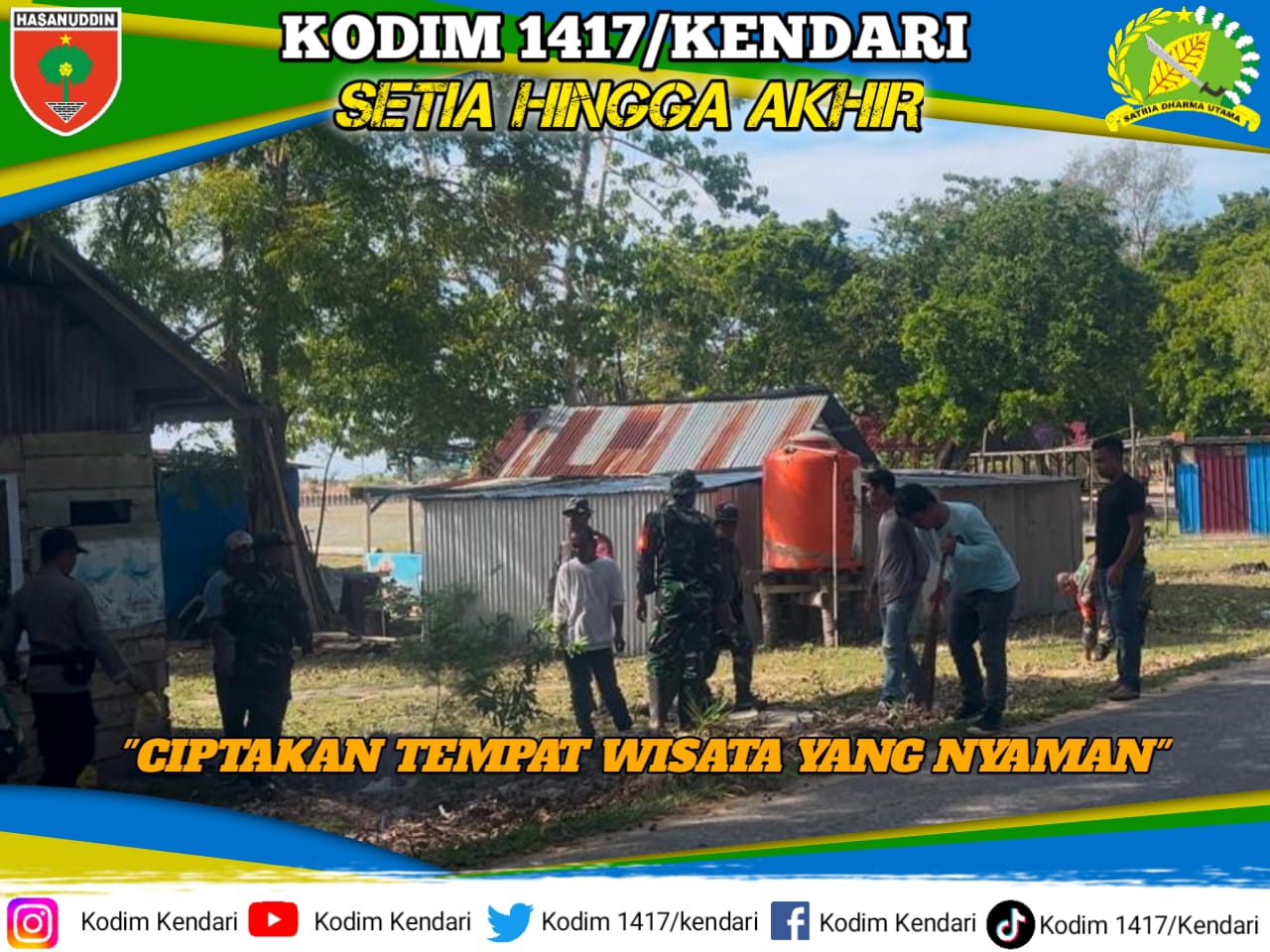 Konawe, fokustime.id_ Personil Babinsa Koramil 1417-12/Soropia Kodim 1417/Kendari melaksanakan kegiatan Karya Bakti bersama masyarakat membersihkan jalan menuju tempat wisata Pantai Toronipa di Kelurahan Toronipa, Kecamatan Soropia, Kabupaten Konawe, Kamis (4/12).