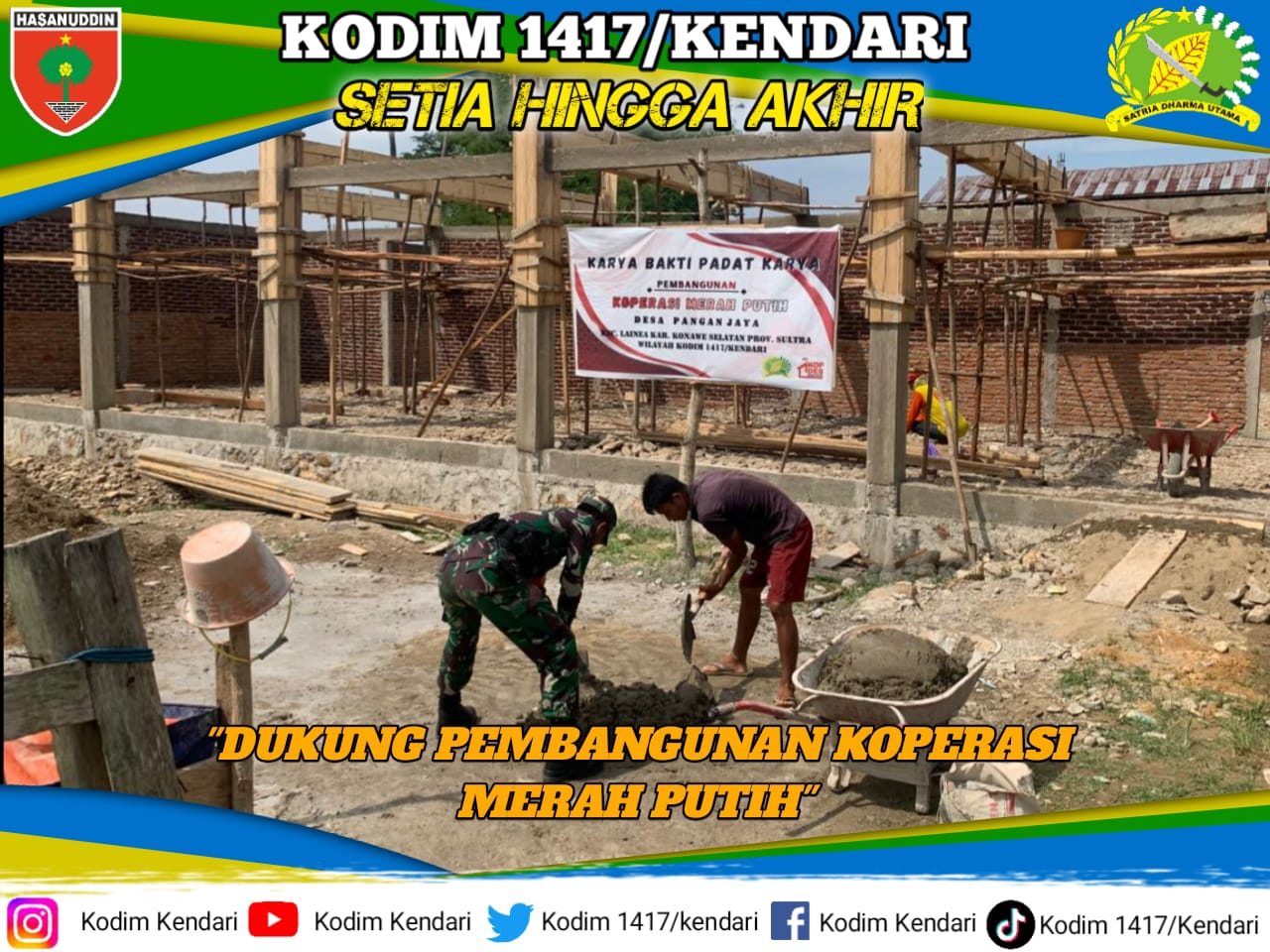Personel Babinsa dari Koramil 1417-04/Lainea Kodim 1417/Kendari Pratu Pratu Ahmat Nur Hidayatullah terjun langsung ke lapangan untuk memantau sekaligus memberikan bantuan tenaga dalam proses pembangunan gedung Koperasi Merah Putih.