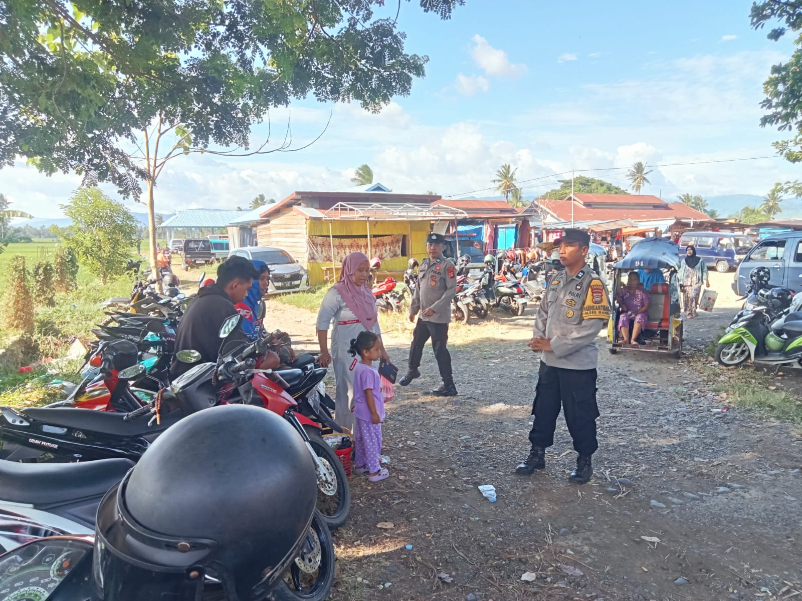 Bhabinkamtibmas Aipda Jamil, S.H. bersama personel Polsek Ganra turun langsung ke lokasi untuk mengatur arus lalu lintas serta membantu masyarakat dan pengunjung pasar agar aktivitas jual beli berjalan dengan aman dan tertib.