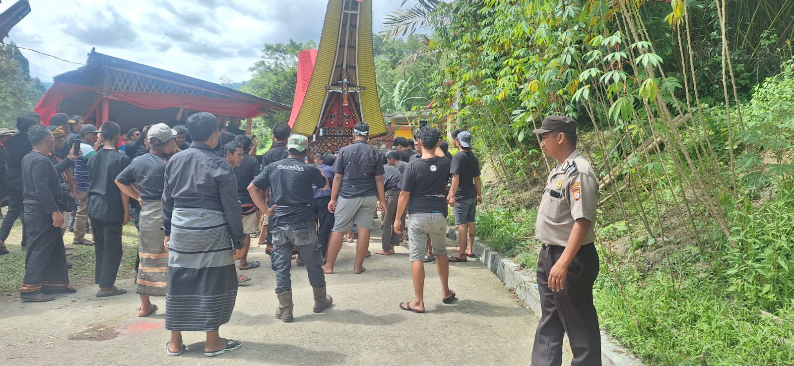 Sejak rangkaian kegiatan dimulai, Bhabinkamtibmas tampak aktif berada di tengah masyarakat, mengawal jalannya prosesi Ma’pasonglo atau pengarakkan jenazah, serta mengatur situasi di sekitar lokasi penerimaan tamu keluarga. Langkah tersebut dilakukan untuk memastikan kegiatan adat berjalan tertib dan aman.