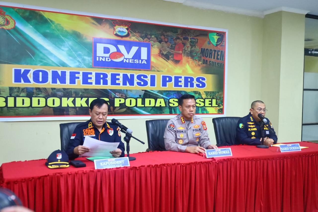 Konferensi pers dipimpin oleh Kabid Humas Polda Sulsel Kombes Pol. Didik Supranoto, S.I.K., M.H., bersama Kapusident Bareskrim Polri Brigjen Pol. Mashudi, S.I.K., S.H., M.Hum., serta Kabiddokkes Polda Sulsel Kombes Pol. dr. Muhammad Haris, M.A.R.S., QHIA.