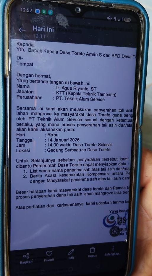 Dalam isi dokumentasi surat PT. TAS tersebut, ada dua poin permintaan data dari pihak perusahaan kepada pemerintah desa Torete. Pertama, meminta list nama-nama penerima sah atas tali asih dan atau kompensasi lahan mangrove. Kedua, meminta berita acara kesepakatan kompensasi antara pemerintah dan masyarakat penerima sah tali asih dan atau kompensasi.
