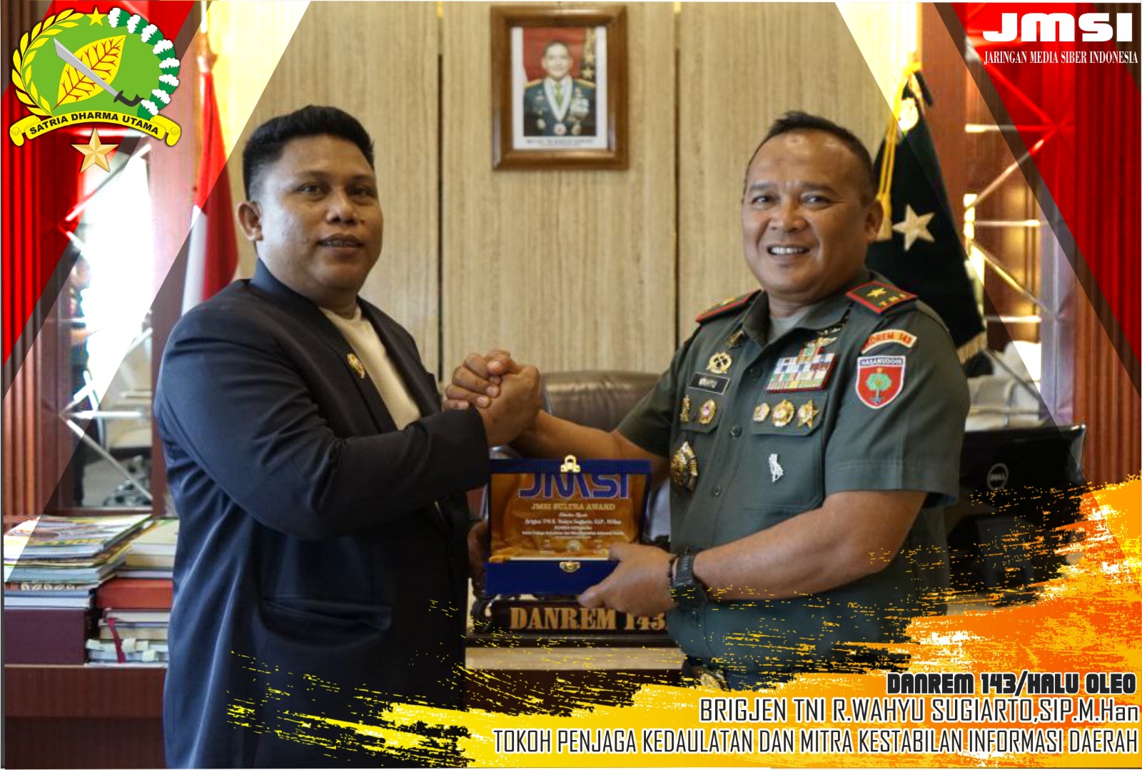 Kendari ,fokustime.id– Komandan Korem 143/Halu Oleo Brigjen TNI R. Wahyu Sugiarto, S.I.P.,M.Han menerima penghargaan sebagai Tokoh Penjaga Kedaulatan dan Mitra Kestabilan Informasi Daerah yang diberikan oleh Jaringan Media Siber Indonesia (JMSI), dalam acara audiensi Danrem 143/HO bersama JMSI Sultra.