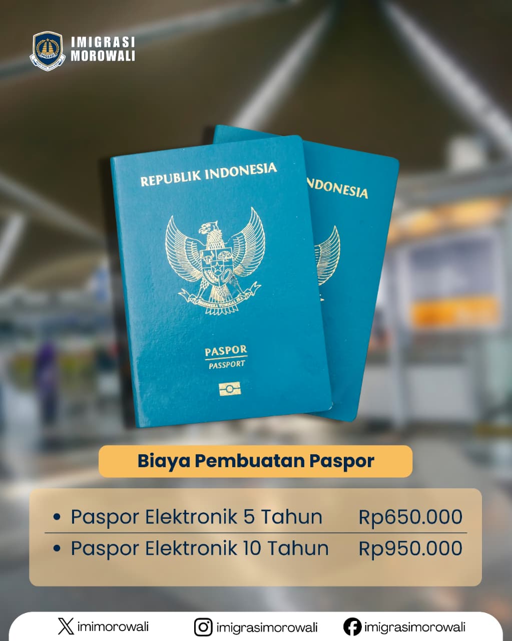 Adapun biaya paspor elektronik (e-paspor) sesuai ketentuan yang berlaku adalah Rp650.000 untuk masa berlaku 5 tahun dan Rp950.000 untuk masa berlaku 10 tahun. Masyarakat diimbau untuk tidak mudah percaya kepada pihak-pihak yang menawarkan jasa percepatan di luar prosedur resmi.