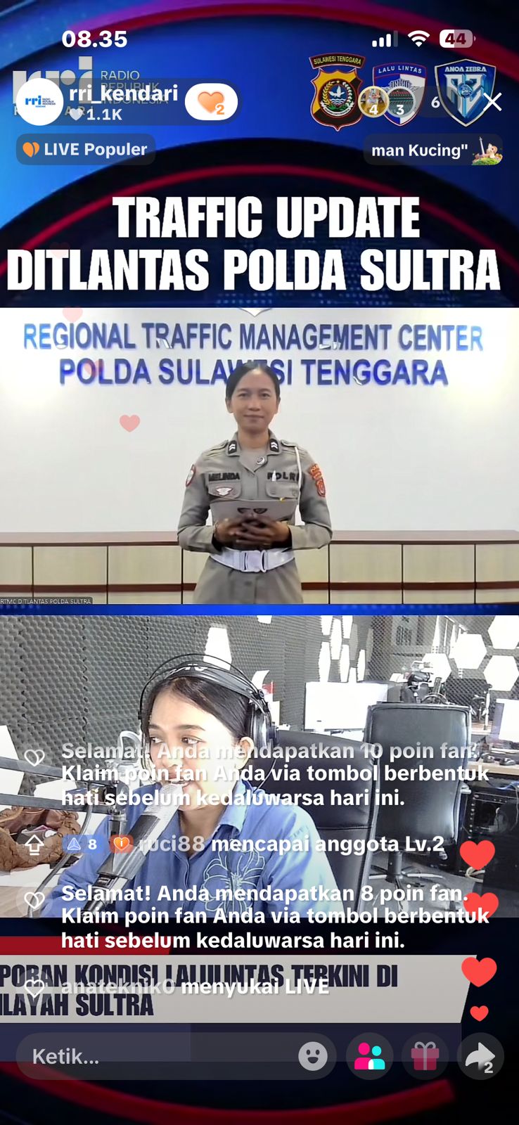 Kasi BPKB Ditlantas Polda Sultra, Kompol Sri Endang Fajar Ningsih, S.I.K., M.H., bersama tim, secara langsung menyampaikan update situasi lalu lintas kepada masyarakat melalui siaran radio. Informasi yang disampaikan meliputi kondisi kepadatan arus kendaraan, titik rawan kemacetan, serta imbauan kepada pengguna jalan agar tetap tertib dan mengutamakan keselamatan.
