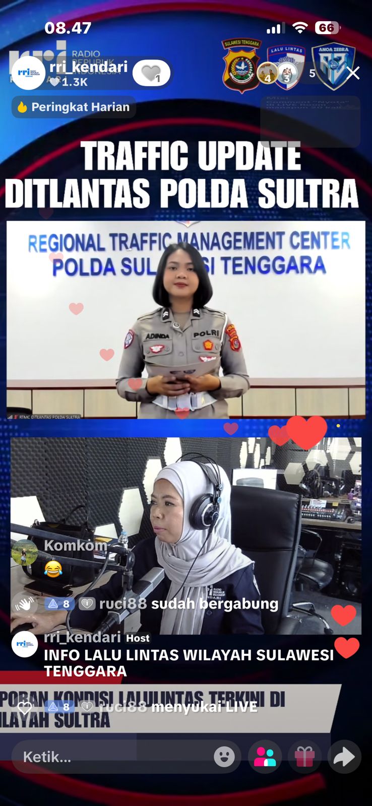 Melalui siaran langsung tersebut, masyarakat mendapatkan informasi terkini terkait kondisi arus lalu lintas, titik rawan kemacetan, serta imbauan keselamatan berkendara. Kegiatan ini menjadi salah satu bentuk pelayanan prima kepolisian dalam mendukung keamanan, keselamatan, ketertiban, dan kelancaran lalu lintas (Kamseltibcarlantas) di wilayah Sulawesi Tenggara.