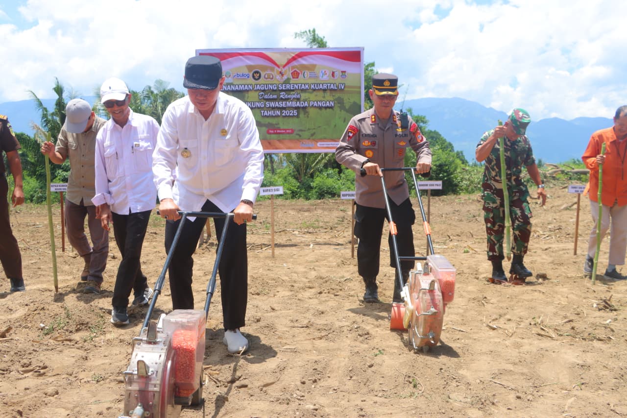 Sementara kegiatan Penanaman Jagung Serentak Kuartal IV oleh Polres Sigi, dipimpin langsung oleh Kapolres Sigi AKBP Kari Amsah Ritonga, S.H., S.I.K., M.H., didampingi oleh Bupati Sigi Mohamad Rizal Intjenae, S.Sos., M.Si., Ketua DPRD Sigi diwakili Ketua Komisi II, Dandim 1306/Kota Palu diwakili Pabung Sigi, Kajari Sigi diwakili Kasi Datun, pimpinan OPD dan stakeholder terkait, serta PJU Polres Sigi, dan perwakilan kelompok tani.