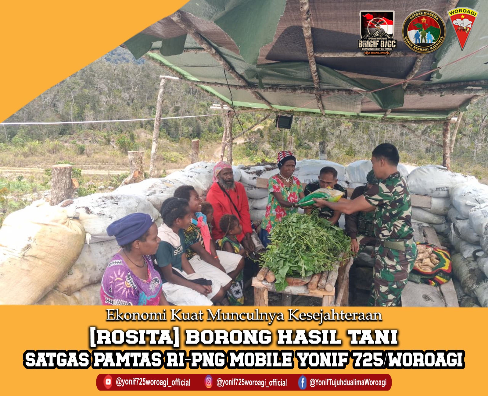 Sabtu (04/04/26) Satgas Pamtas RI-PNG Mobile Yonif 725/Wrg 21 prajurit TK Maki melaksanakan Rosita kepada masyarakat Kolayak. Kegiatan ini merupakan peran sebagai bangsa Indonesia dalam membantu perekonomian masyarakat dengan menjadi subjek dan objek yang berpartisipasi aktif dalam meningkatkan cinta produk lokal, baik sukarela maupun profesional demi mengurangi cacat ekonomi. Tidak hanya itu Dan TK Maki juga memberikan bantuan berupa beras dan Alkitab sebagai tanda awal silaturahmi.