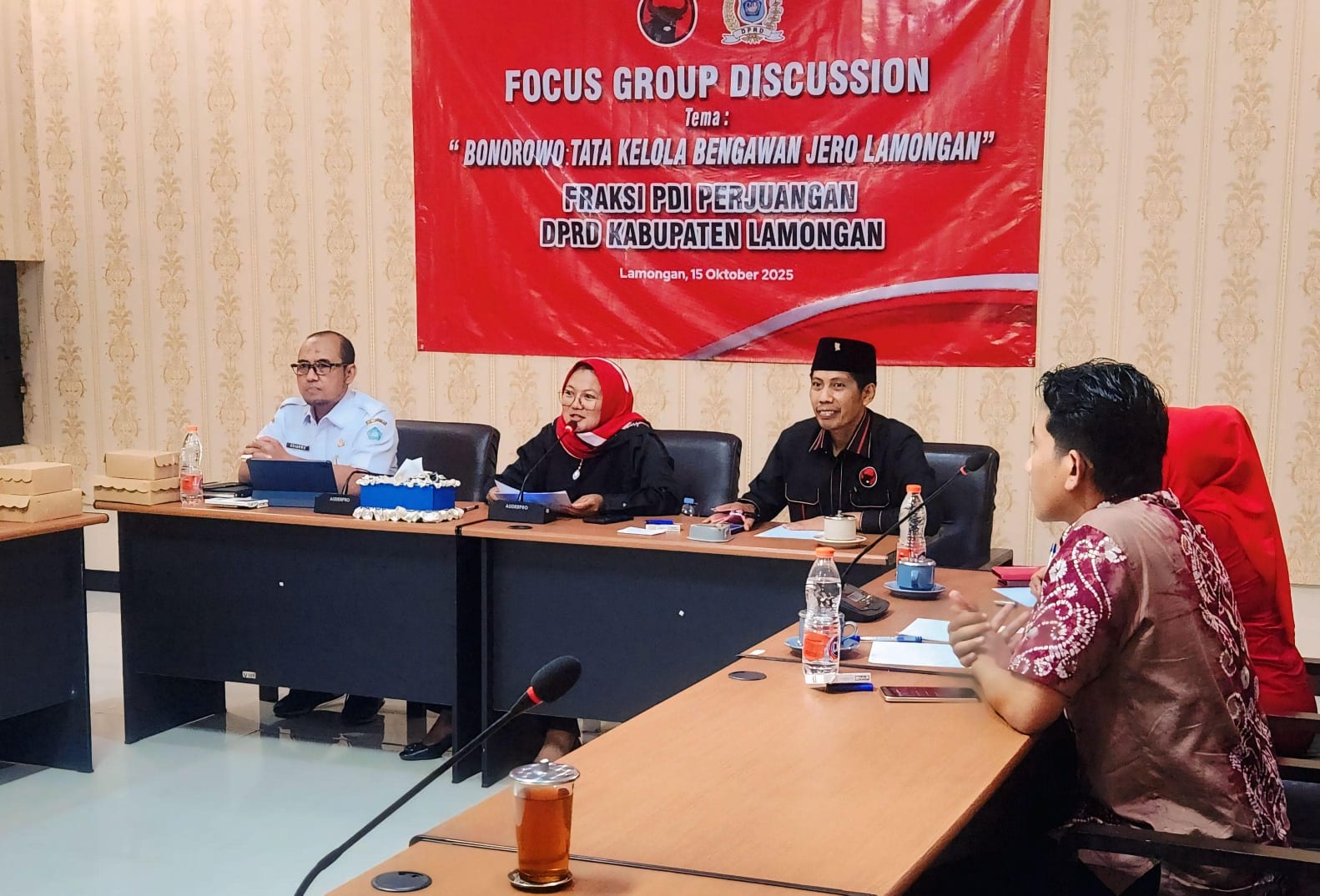 Lamongan ,fokustime.id- Fraksi PDI Perjuangan DPRD Lamongan bergerak cepat mencari solusi konkret terkait persoalan banjir dan kekeringan ekstrem di wilayah Bengawan Jero. Untuk pertama kalinya, Fraksi PDIP menggelar Focus Group Discussion (FGD) bertema “Bonorowo: Tata Kelola Bengawan Jero Lamongan” di ruang Komisi B, Rabu (15/10/2025).