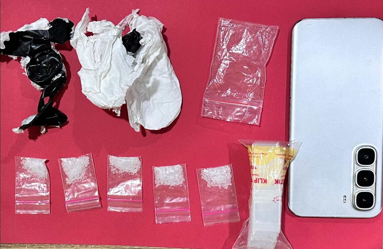Dari tangan terduga pelaku, petugas menemukan 5 sachet plastik bening yang diduga berisi narkotika jenis sabu dengan berat sekitar 4,48 gram.