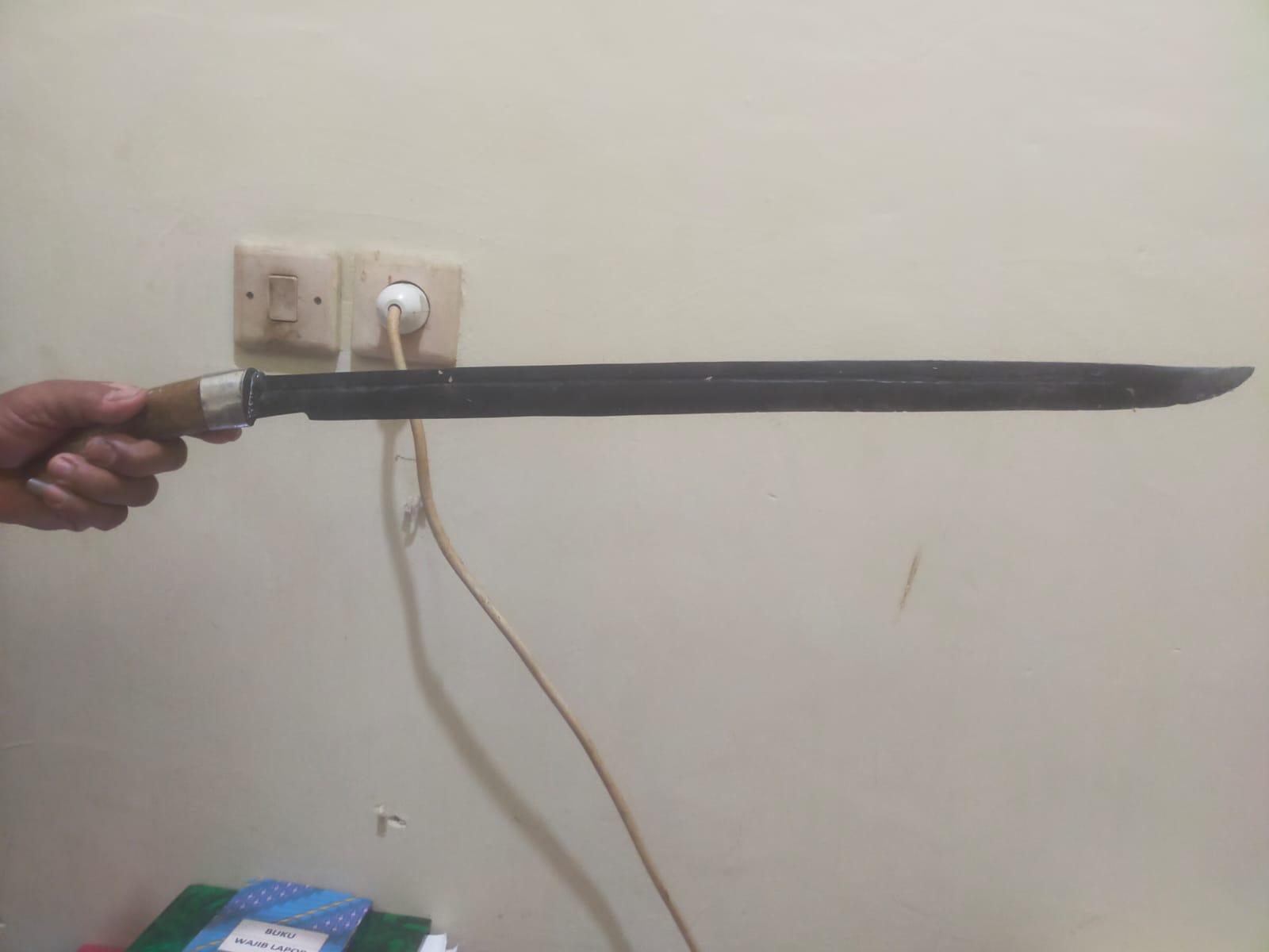 Korban kemudian mengambil benda tajam berbentuk taji dari dalam jok sepeda motornya.