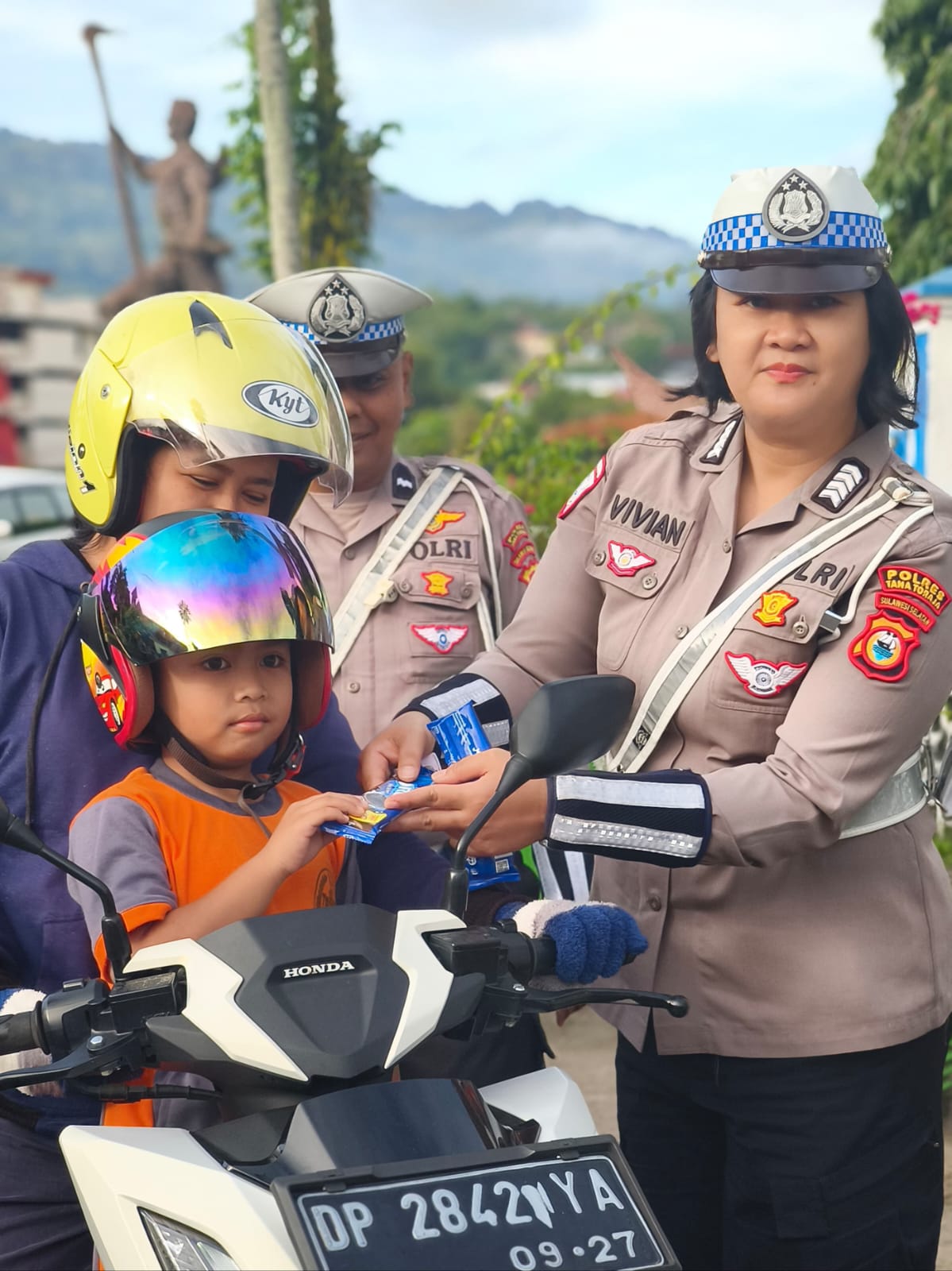 Terlihat petugas memberikan edukasi keselamatan, membagikan brosur, hingga menyerahkan bunga sebagai bentuk pendekatan humanis kepada pengendara.