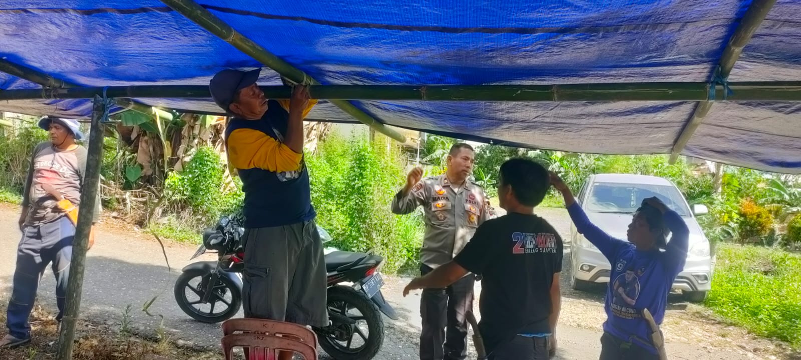 Enrekang, fokustime.id- Dalam rangka menyambut perayaan Natal dan Tahun Baru (Nataru), Kapolsek Alla, Iptu Maga bersama personel Polsek Alla turut serta dalam kegiatan gotong royong pemasangan tenda di lingkungan Gereja Ck Kalpari Sudu Kecamatan Alla, Kabupaten Enrekang, Senin 15/12/2025.