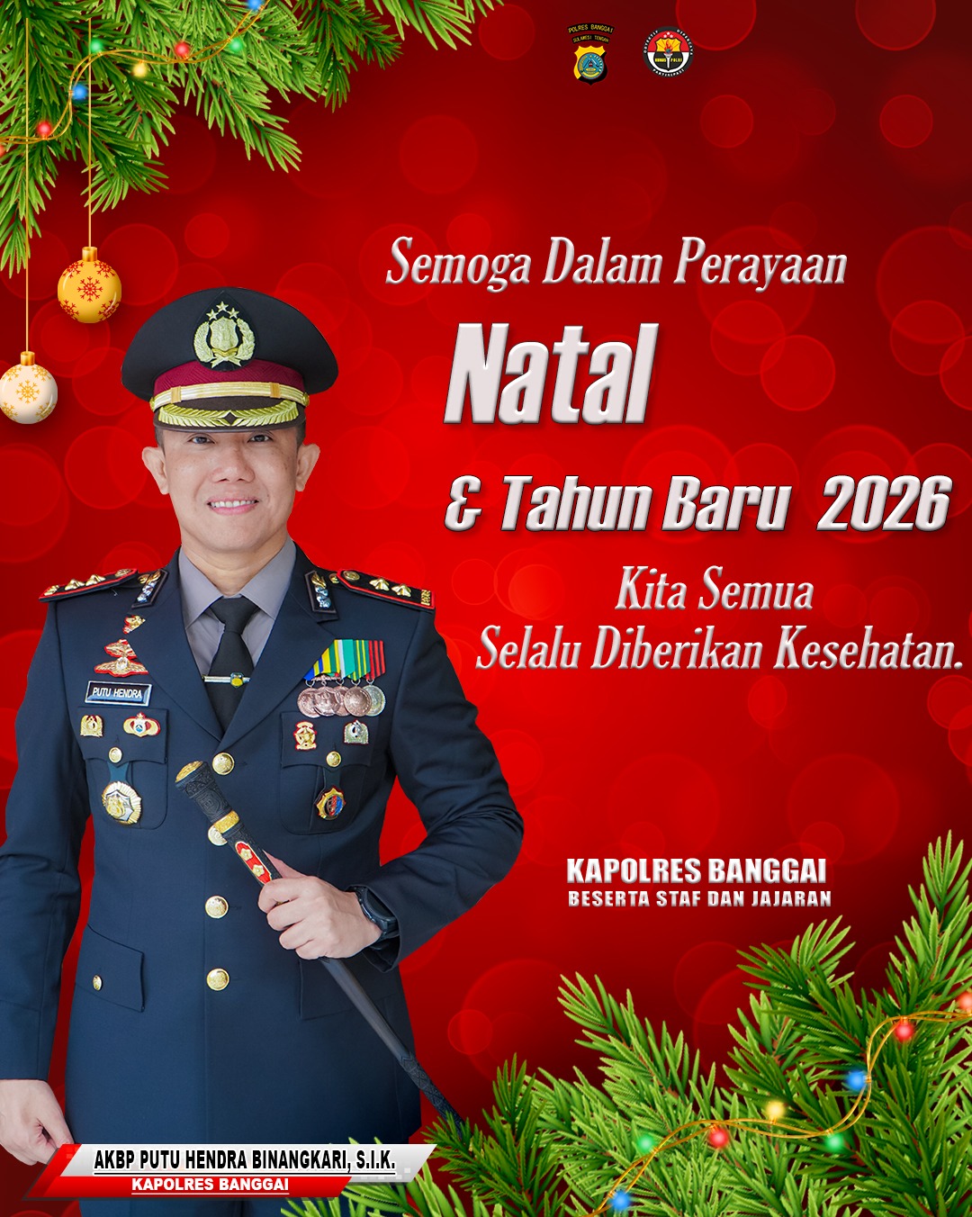 Banggai, fokustime.id – Kepala Kepolisian (Kapolres) Banggai, AKBP Putu Hendra Binangkari, S.I.K., beserta personil dan Bhayangkari menyampaikan ucapan selamat Natal (25/12/2025) dan Bahagia Tahun Baru (1/1/2026) bagi seluruh