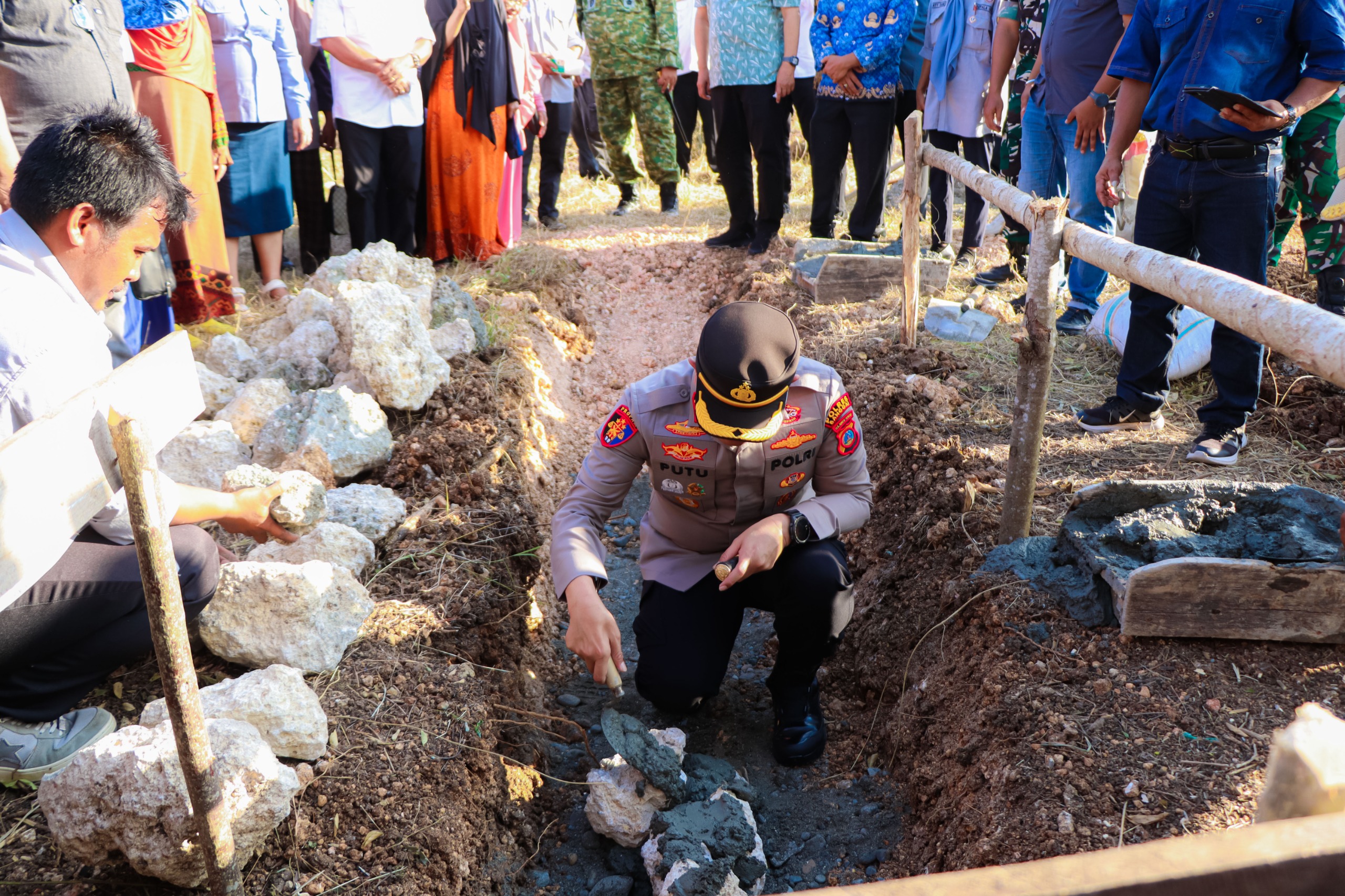 Banggai,fokustime.id – Kapolres Banggai, AKBP Putu Hendra Binangkari, S.I.K., bersama jajaran Forkopimda menghadiri kegiatan peletakan batu pertama pembangunan fisik 800 gerai Koperasi Merah Putih di Desa Kayutanyo, Kecamatan Luwuk Timur, Jumat (17/10/2025).