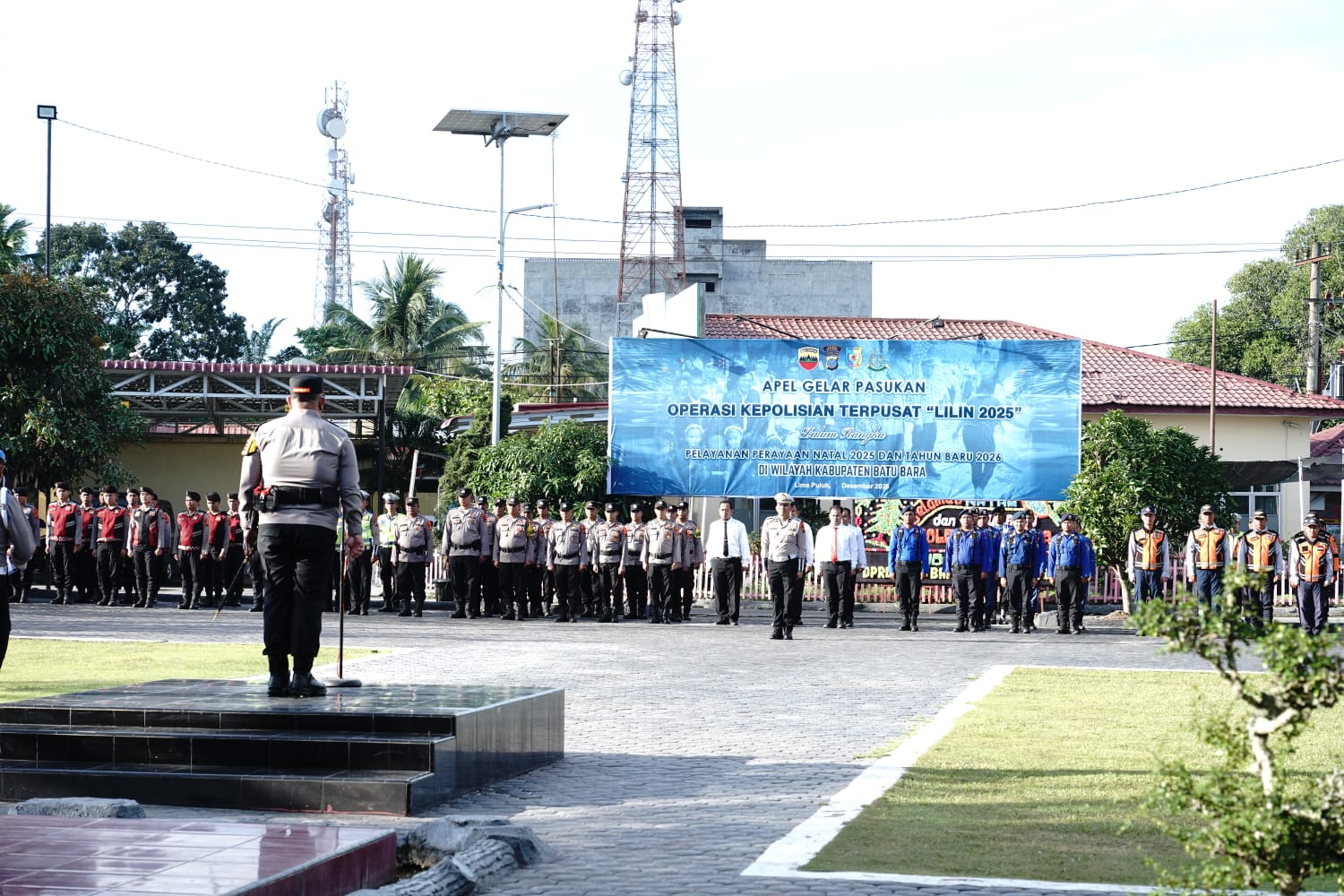 Polres Batu Bara menggelar Apel cek pada persiapan personel Pasukan Operasi Kepolisian Terpusat Lilin Toba 2025 dalam rangka pengamanan perayaan Natal 2025 dan Tahun Baru 2026, kegiatan dilaksanakan halaman Mapolres Batubara jalan perintis limapuluh kota, pada Jum’at 19 Des 2025 .