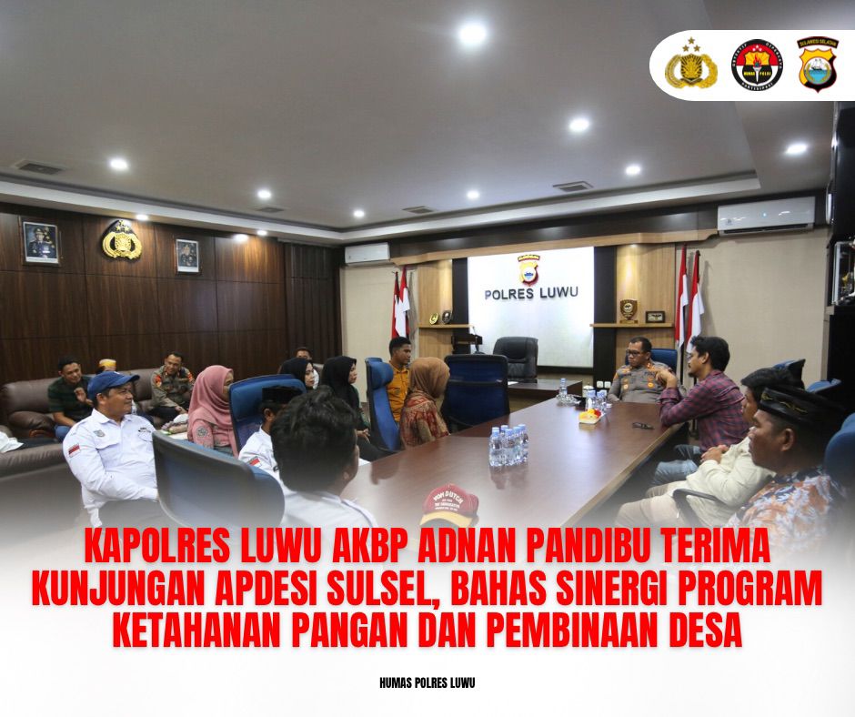Luwu,fokustime.id — Kapolres Luwu, AKBP Adnan Pandibu, S.H., S.I.K., menerima kunjungan silaturahmi Ketua DPD Asosiasi Pemerintah Desa Seluruh Indonesia (Apdesi) Provinsi Sulawesi Selatan, Andi Sri Rahayu Usmi, S.Pd., bersama Ketua Apdesi Kabupaten Luwu dan sejumlah kepala desa, Kamis (9/10/2025) bertempat di ruang kerja Kapolres Luwu.