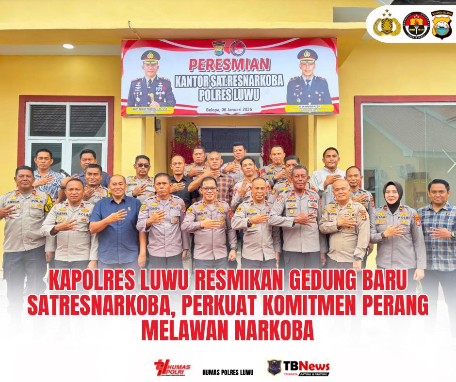 Luwu ,fokustime.id– Kapolres Luwu AKBP Adnan Pandibu, S.H., S.I.K., meresmikan gedung baru Kantor Satuan Reserse Narkoba (Satresnarkoba) Polres Luwu yang berlokasi di dalam kompleks Mapolres Luwu, Selasa (06/12/2025).
