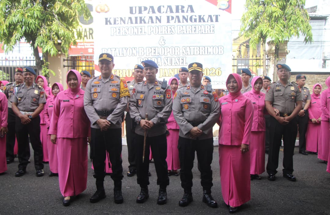 Pada kesempatan yang sama, Kapolres Parepare juga mengukuhkan kenaikan pangkat setingkat lebih tinggi bagi 37 personel Yon B Pelopor Brimob, yang dihadiri langsung oleh Komandan Yon B Pelopor Brimob Kompol Dr. Ramli.
