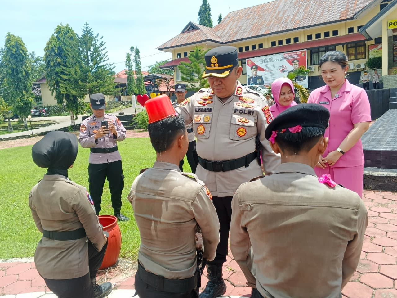 Prosesi tradisi penerimaan ditandai dengan penyiraman air kembang sebagai simbol kesiapan mental dan fisik para Bintara Remaja dalam menjalankan tugas kepolisian.