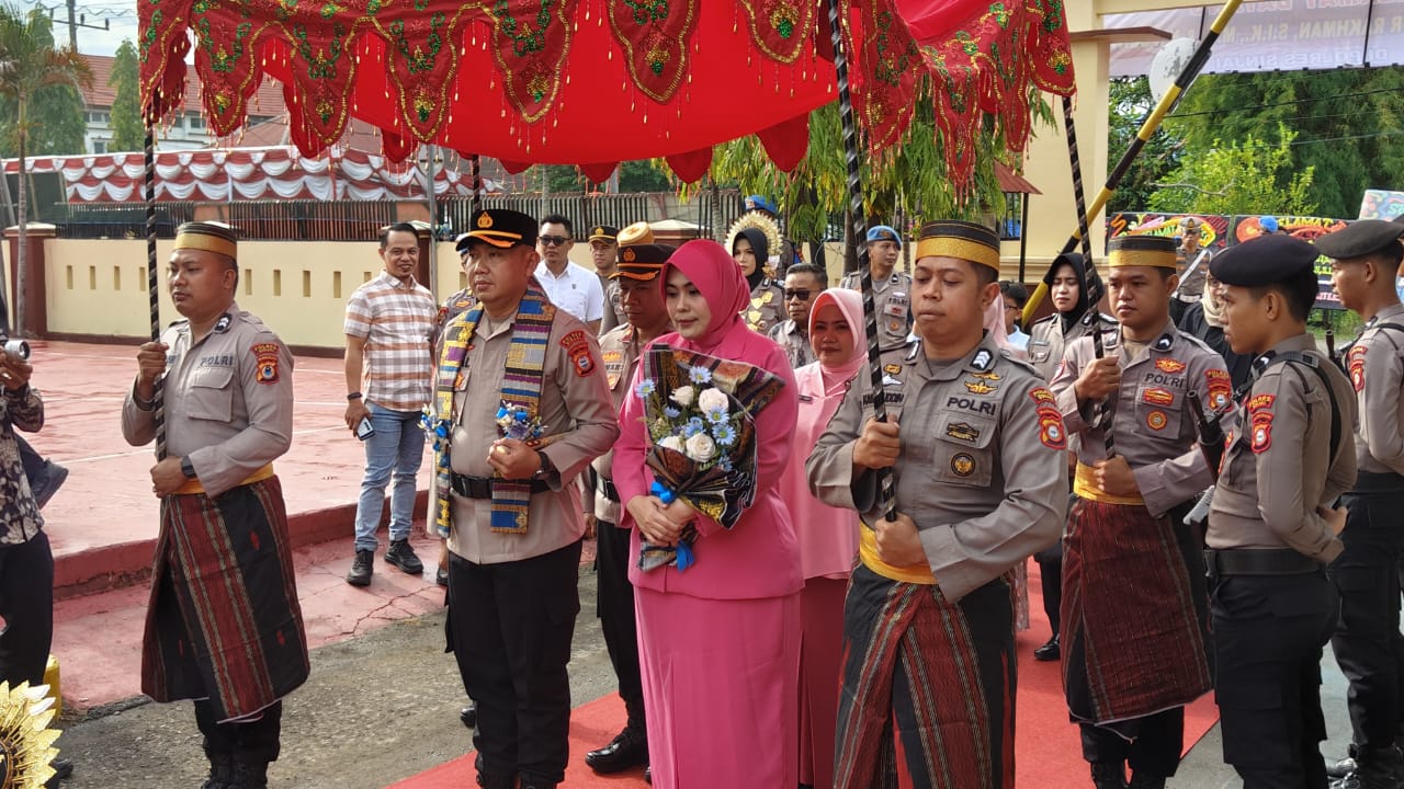 Prosesi penyambutan dimulai dengan pengalungan bunga kepada Kapolres Sinjai oleh Wakapolres Sinjai Kompol Tamar, S.Sos. Pada kesempatan yang sama, Ketua Bhayangkari Cabang Sinjai, Ny. Rina Harry, menerima buket bunga dari pengurus Bhayangkari Cabang Sinjai.