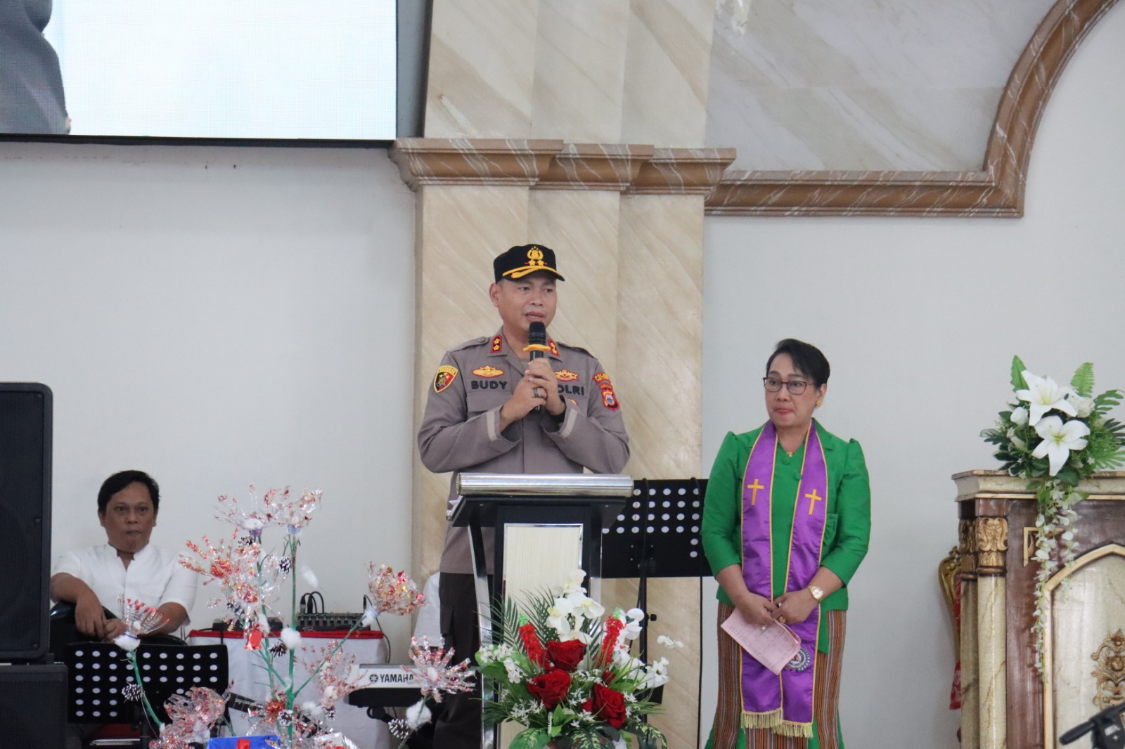 Di sela kegiatan tersebut, Kapolres juga menyampaikan ucapan Selamat Natal kepada jemaat serta memberikan pesan kamtibmas.