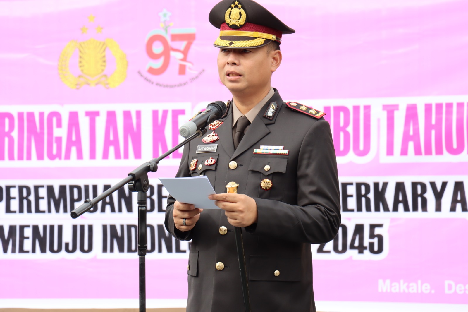 Kapolres Tana Toraja AKBP Budi Hermawan, S.I.K., dalam amanatnya menyampaikan bahwa peringatan Hari Ibu merupakan momentum penting untuk mengenang jasa, pengorbanan, serta peran strategis kaum ibu dalam membentuk karakter generasi penerus bangsa.