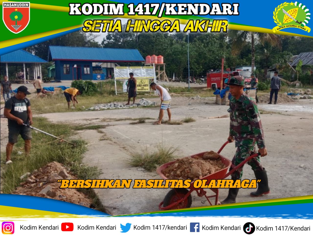 Karya Bakti Babinsa Koramil 1417-09/Ranomeeto Bersihkan Fasilitas Olahraga di Konawe Selatan