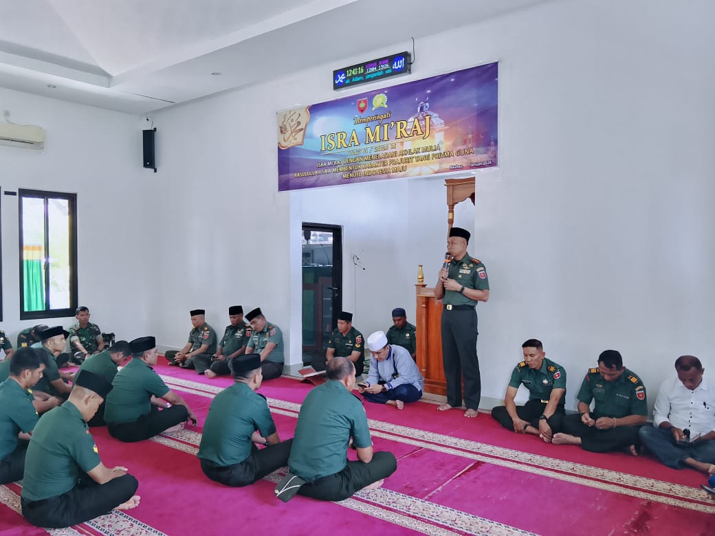 Kegiatan keagamaan ini diikuti oleh prajurit, PNS Kodim 1413/Buton, serta Ibu-ibu Persit Kartika Chandra Kirana Cabang Kodim 1413/Buton sebagai wujud pembinaan rohani dan upaya meningkatkan keimanan serta ketakwaan kepada Allah SWT. Peringatan Isra Mi’raj kali ini mengusung tema “Meneladani Akhlak Mulia Rasulullah SAW sebagai Landasan Membentuk Prajurit yang Beriman, Bertakwa dan Berakhlak Mulia.”