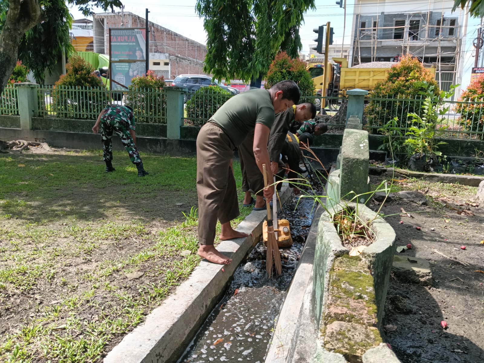 Seluruh personel bahu-membahu membersihkan sampah, lumpur, dan rumput liar yang menumpuk di saluran air. Dengan membersihkan got, diharapkan aliran air menjadi lancar, sehingga dapat meminimalisir risiko genangan air dan banjir di lingkungan asrama maupun permukiman warga sekitar.