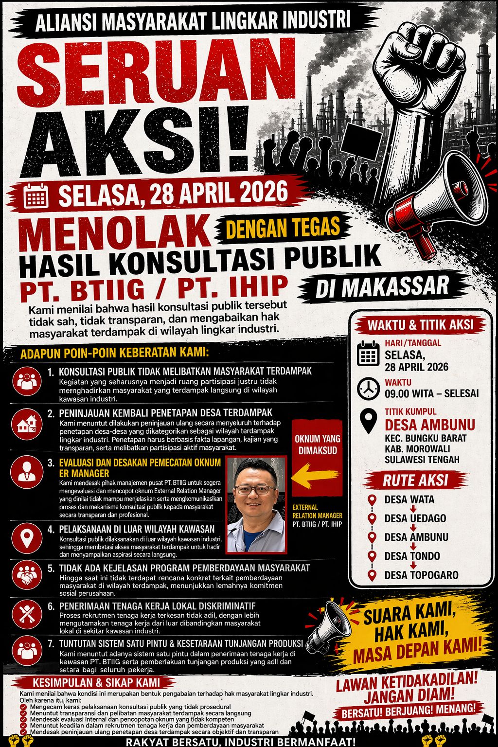 Aksi unjuk rasa tersebut, rencananya akan dilaksanakan pada, Selasa, 28 April 2026. Mulai pukul 09.00 wita, melalui rute aksi dari desa Wata, Uedago, Ambunu, Tondo dan Desa Topogaro dengan sasaran Kawasan industry PT. BTIIG / PT. IHIP. Untuk titik kumpul akan ditentukan malam mini setelah dilakukannya setting aksi bersama sejumlah tokoh masyarakat, aktivis dan tokoh pemuda lingkawasan industri.
