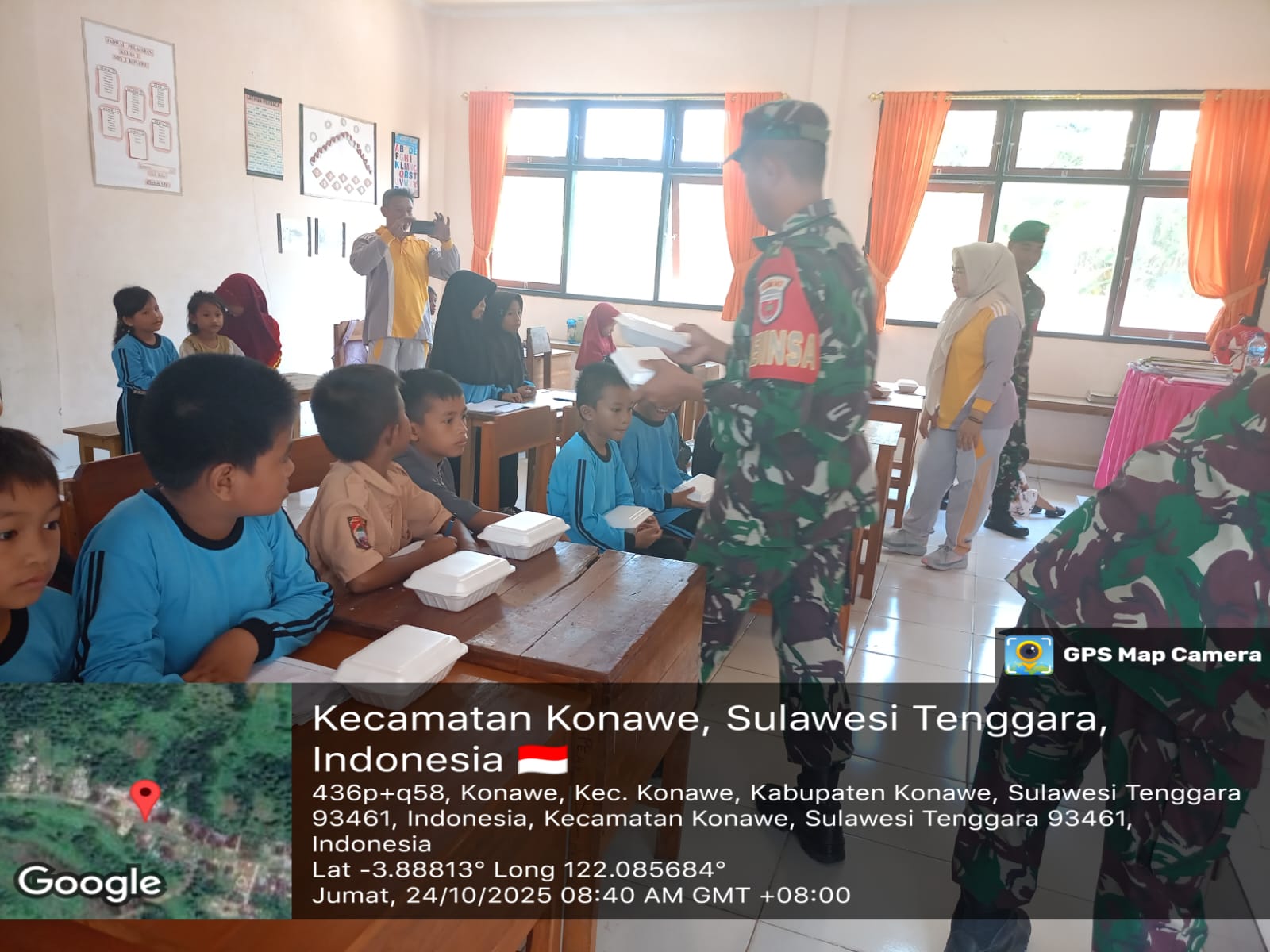 Konawe, fokustime.id– Komitmen Koramil 1417-02/Wawotobi Kodim 1417/Kendari dalam mendukung kesehatan dan pendidikan generasi bangsa diwujudkan melalui kegiatan “Akselerasi Penerima Manfaat Dapur Satuan” yang sukses dilaksanakan pada Jumat, 24 Oktober 2025, pukul 08.30 WITA. Kegiatan ini difokuskan di SDN 2 Konawe, Kel. Konawe, Kec. Konawe, Kab. Konawe, dengan menyasar 63 siswa dan siswi.
