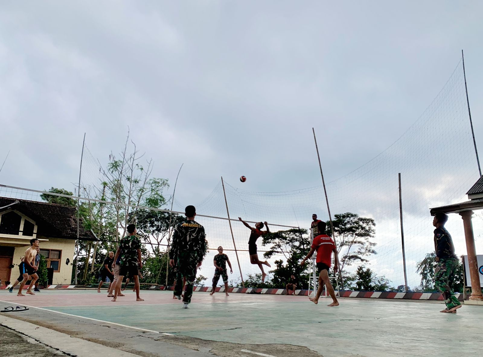 Wonogiri ,fokustime.id- Disela-sela padatnya kegiatan pengerjaan sasaran fisik pada pelaksanaan TMMD Reguler 127, anggota satgas meluangkan waktu istirahat sambil menunggu saatnya berbuka puasa untuk olahraga bola voli bersama pemuda yang tergabung dalam Karang Taruna Desa Kembang. Mereka berpartisipasi dalam pertandingan persahabatan volly yang sangat seru dan membangun kebersamaan antar anggota Satgas TMMD-127 dan masyarakat.