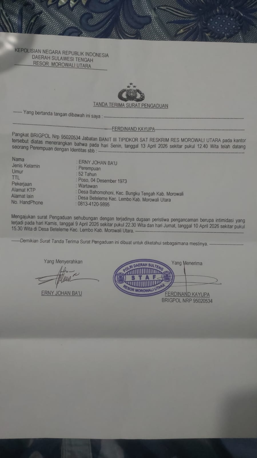 Berdasarkan Surat Tanda Terima Pengaduan Laporan (STTPL) Erni Johan Bau atau biasa disapa Bunda Mega mengajukan surat pengaduan sehubungan dengan terjadinya dugaan peristiwa pengancaman berupa intimidasi yang terjadi pada hari Kamis, tanggal 9 April 2026 sekitar pukul 22.30 wita dan hari Jumat, tanggal 10 April 2026 sekitar pukul 15.30 wita di Desa Beteleme Kecamatan Lembo Kabupate Morowali Utara.