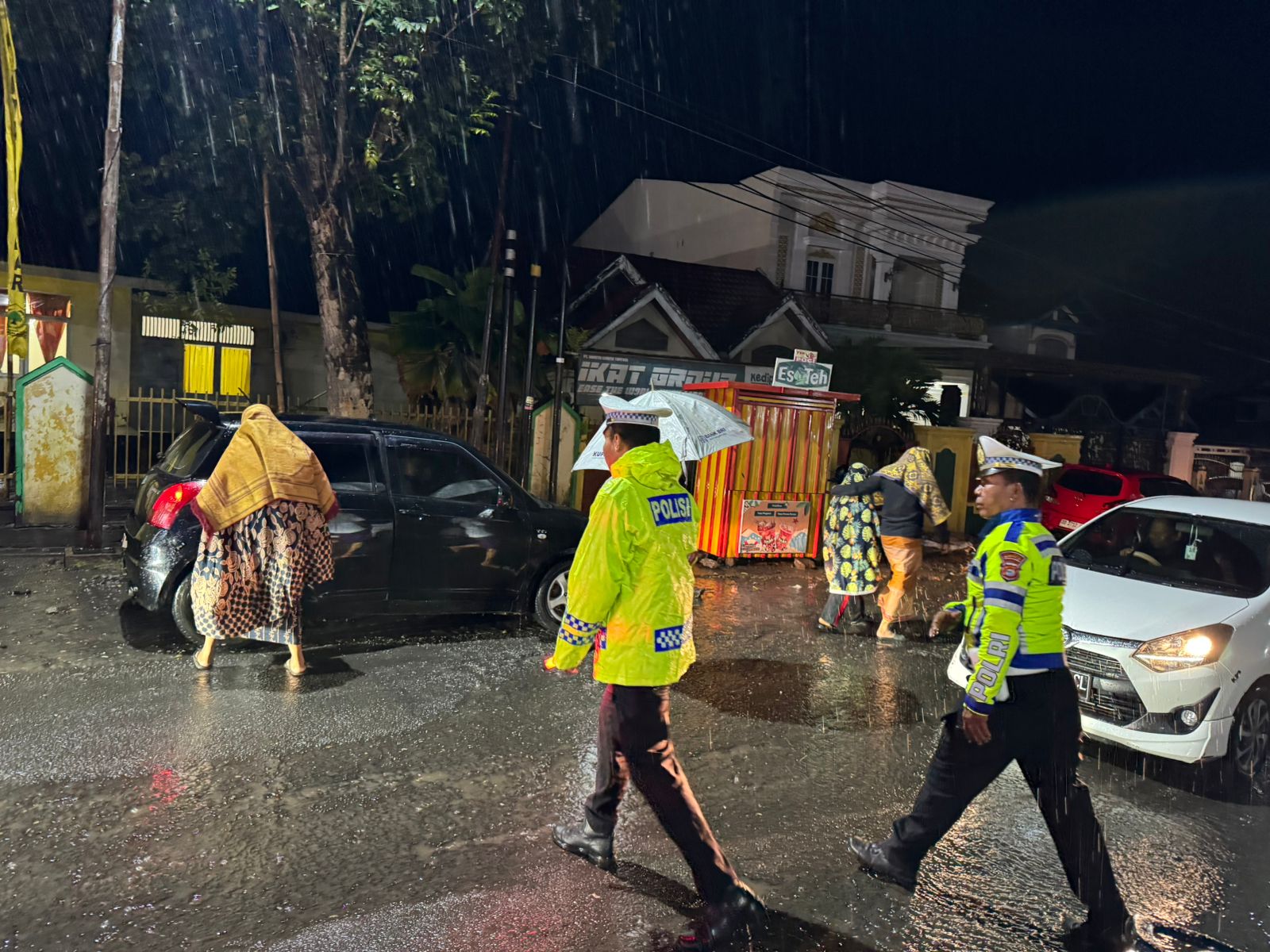Meskipun hujan turun di sejumlah titik wilayah, personel tetap melaksanakan tugas dengan penuh tanggung jawab. Kondisi cuaca tidak menyurutkan semangat aparat dalam memberikan pelayanan terbaik kepada masyarakat yang melaksanakan ibadah di bulan suci Ramadan 1447 H.