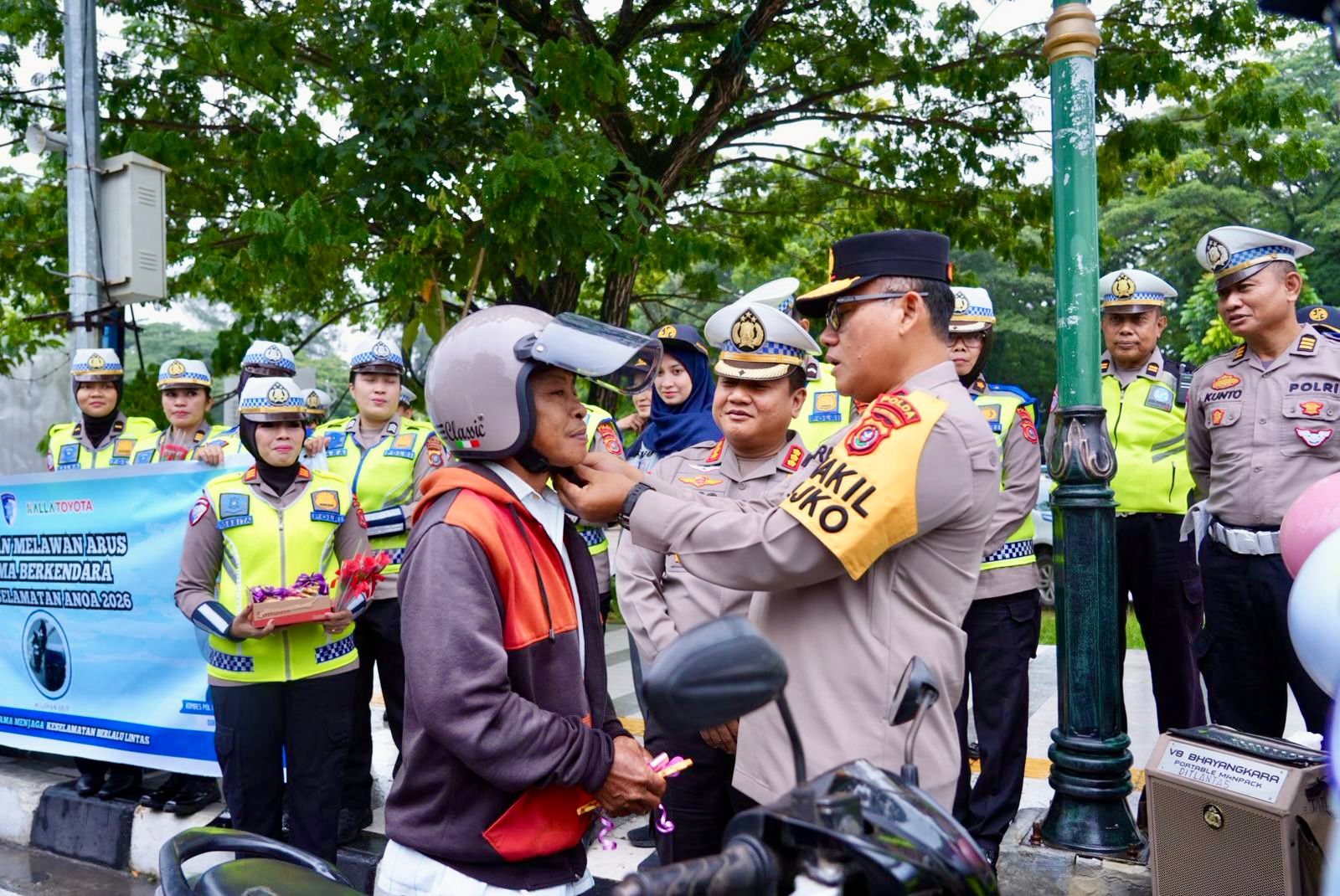 Kampanye keselamatan tersebut dilaksanakan dengan pendekatan edukatif, persuasif, dan humanis melalui pembagian helm gratis serta setangkai bunga kepada para pengguna jalan. Selain itu, personel kepolisian juga memberikan imbauan langsung kepada pengendara roda dua dan roda empat mengenai pentingnya tertib berlalu lintas.