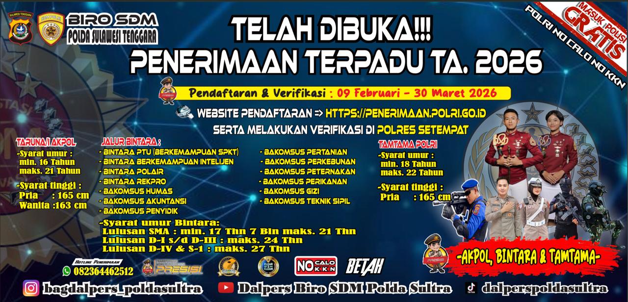 Konawe Utara ,fokustime.id– Kepolisian Negara Republik Indonesia melalui Biro SDM Polda Sulawesi Tenggara resmi membuka Penerimaan Terpadu Polri Tahun Anggaran 2026. Pendaftaran dan proses verifikasi administrasi berlangsung mulai 9 Februari hingga 30 Maret 2026.
