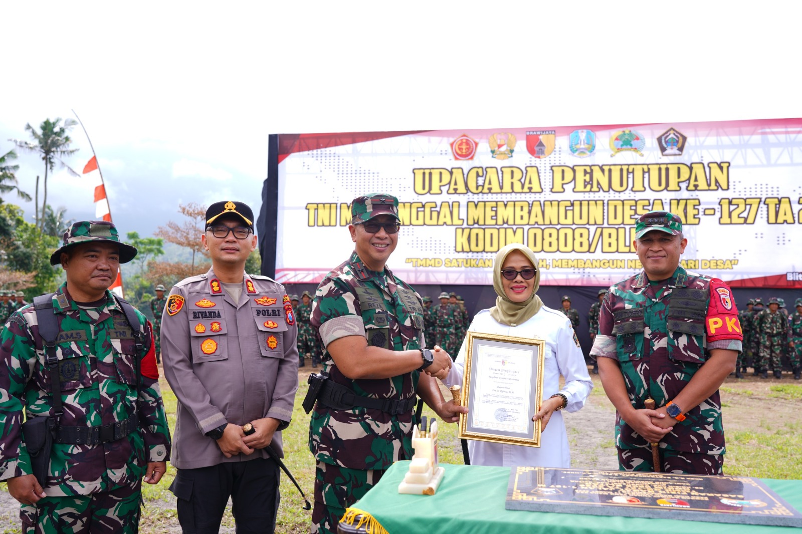 Sementara itu, Pabung Kodim 0808/Blitar Mayor Cke Supriyono saat ditemui menyampaikan bahwa TMMD merupakan program terpadu yang bertujuan mempercepat pembangunan di wilayah pedesaan, khususnya daerah terpencil atau tertinggal. Selain pembangunan fisik seperti jalan, jembatan dan sarana air bersih, TMMD juga menghadirkan berbagai kegiatan non-fisik berupa penyuluhan bela negara, wawasan kebangsaan, hukum, pertanian, kesehatan termasuk stunting, Posyandu serta bahaya narkoba. Usai upacara penutupan, kegiatan dilanjutkan dengan peninjauan hasil pembangunan berupa rabat jalan, RTLH, jambanisasi serta Jembatan Merah Putih (Dim0808).