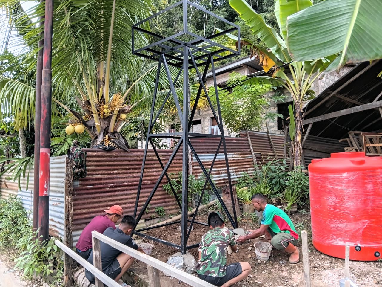 Sinergi antara personel TNI dan warga setempat terlihat jelas dalam proses pengecoran fondasi serta perakitan struktur dudukan tandon tersebut.