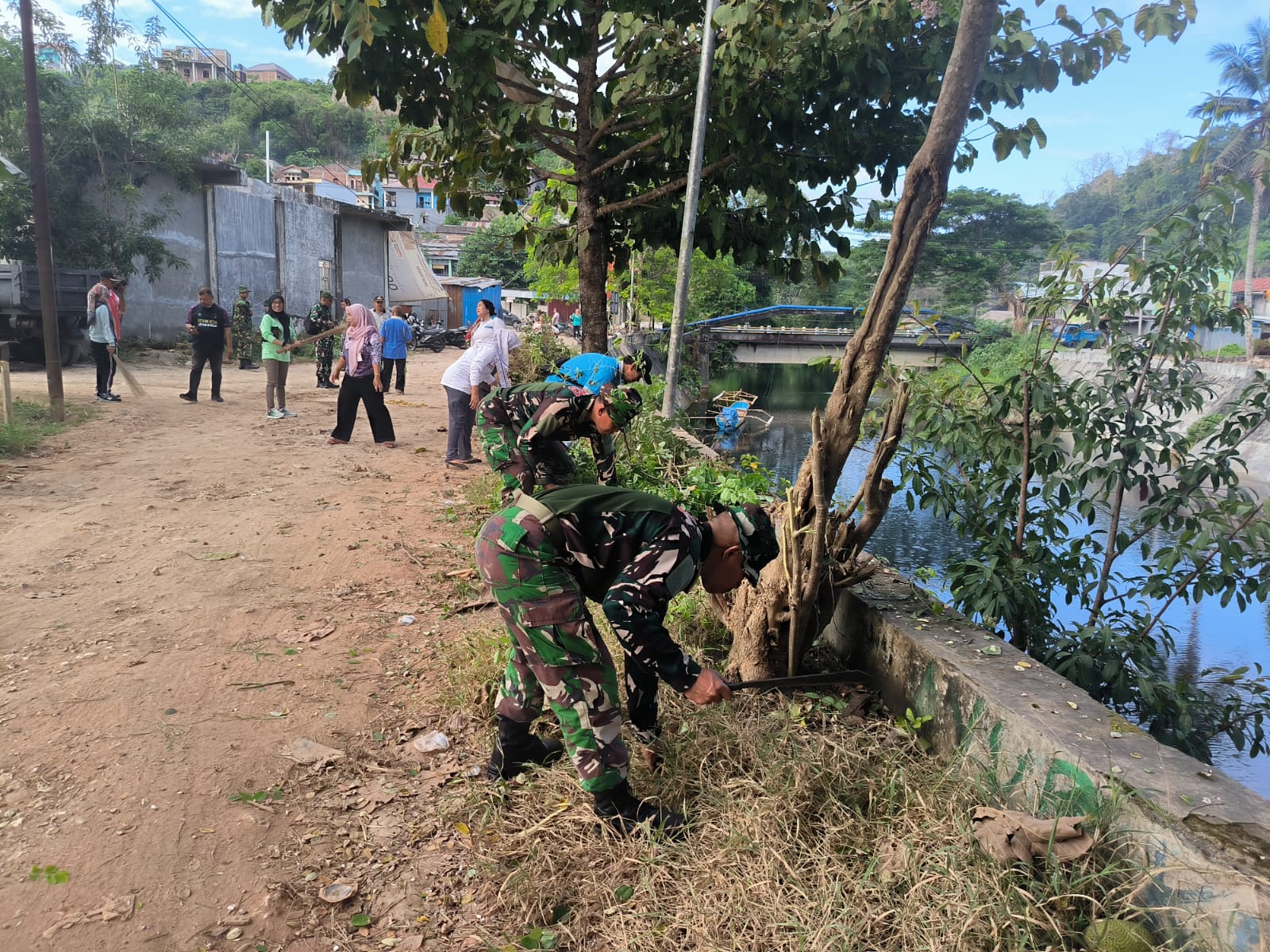 Baubau ,fokustime.id— Dalam upaya menjaga kebersihan lingkungan serta meningkatkan kenyamanan dan keselamatan masyarakat, personel Koramil 1413-01/Wolio yang dipimpin oleh Pelda Umiadin bersama warga melaksanakan kegiatan kerja bakti pembersihan jalan di pinggiran tanggul Kali Ambon, Kelurahan Tomba, Kecamatan Wolio, Kota Baubau, Senin (15/12/2025).