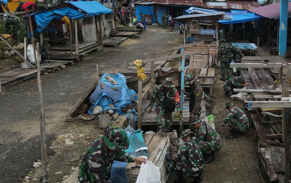 Personel Koramil 1413-13/Sorawolio dan Warga Gelar Kerja Bakti Bersihkan Area Pasar Tradisional