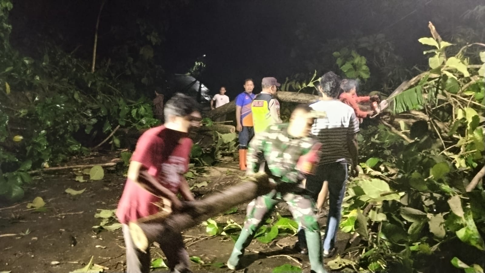 Babinsa Koramil 12/Simo Kodim 0724/Boyolali Serda Joko Riyanto bersama warga langsung turun tangan mengevakuasi batang dan ranting yang melintang di badan jalan. Berkat gotong royong, akses kendaraan berhasil dibuka kembali dalam waktu singkat.