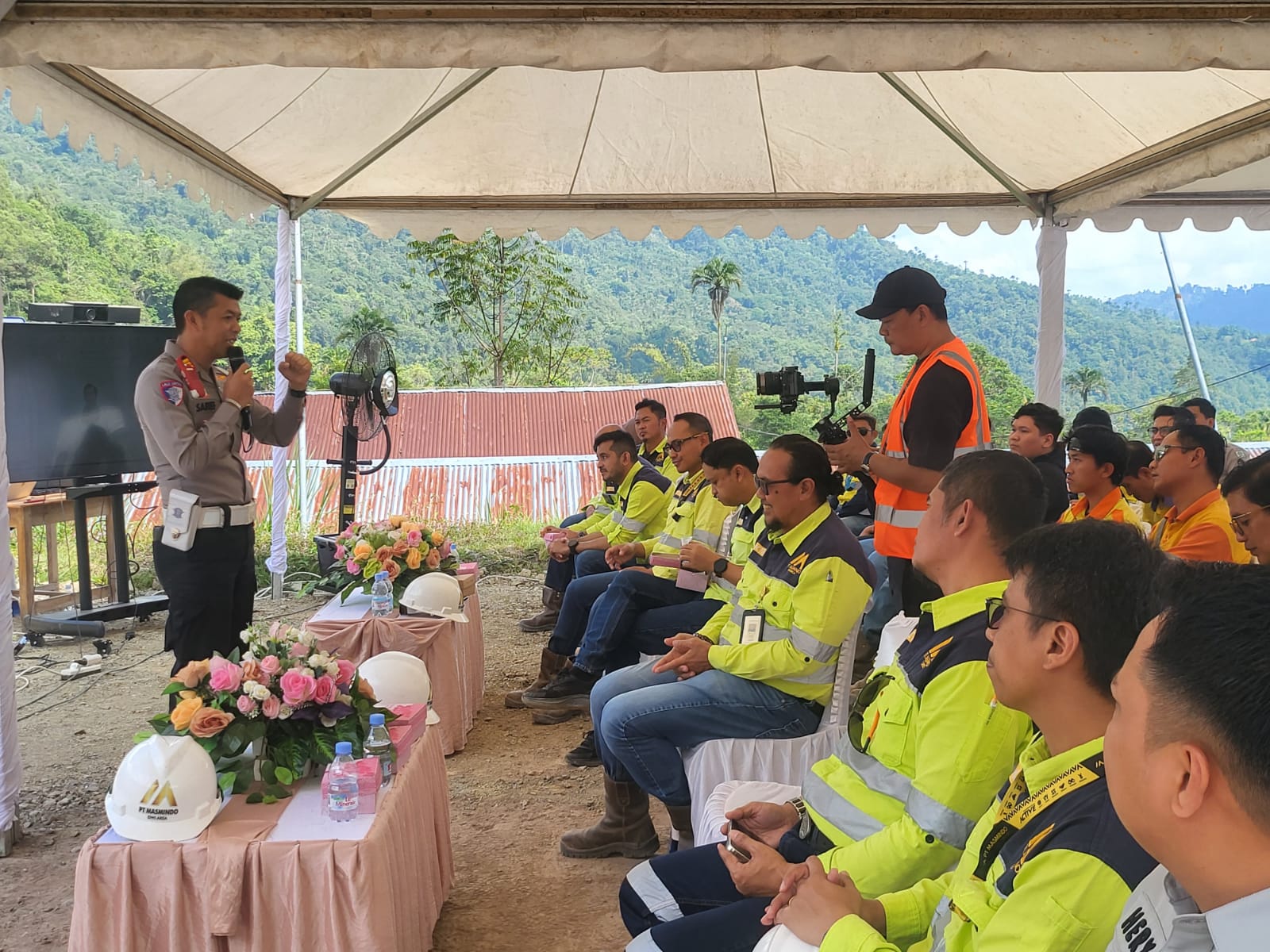 Materi yang diberikan mencakup pentingnya disiplin berlalu lintas, penggunaan alat pelindung diri (APD) yang sesuai standar, serta penerapan budaya tertib dan aman saat berkendara di lingkungan kerja tambang.