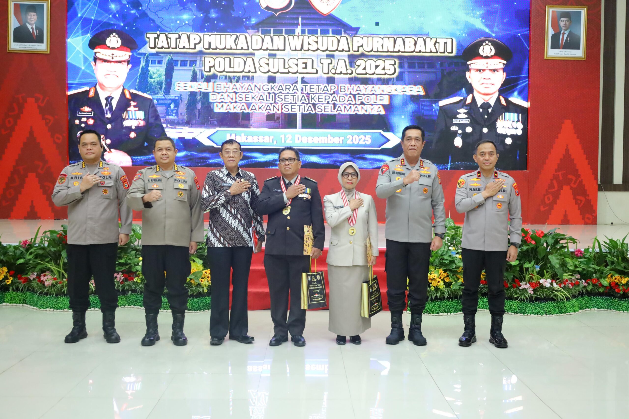 Turut hadir Wakapolda Sulsel Brigjen Pol. Nasri, S.I.K., M.H., Pejabat Utama Polda Sulsel, Ketua PP Polri Daerah Sulawesi Selatan beserta pengurus, serta para wisudawan purnabakti. Kehadiran para pejabat dan keluarga besar Polri ini menjadi simbol penghargaan serta ikatan emosional yang kuat antara anggota aktif dan para purnawirawan.