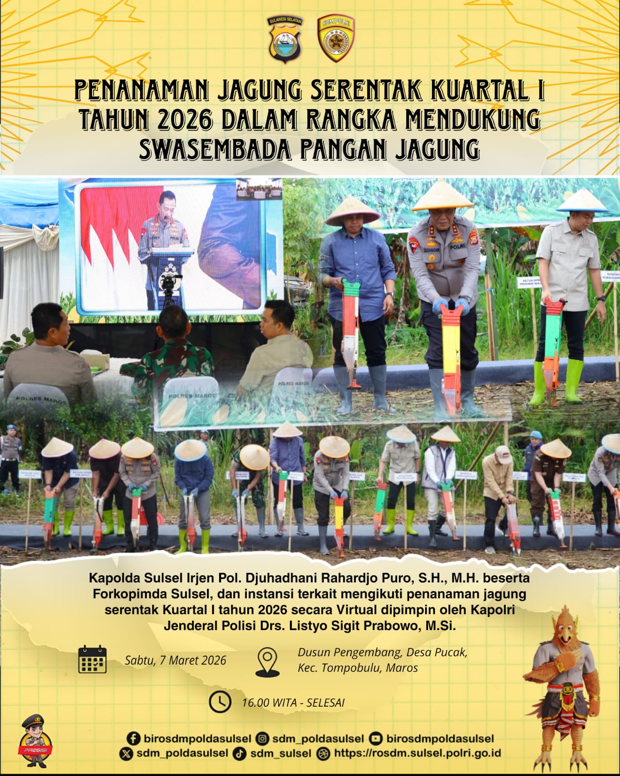 “Melalui kegiatan ini diharapkan dapat mendorong peningkatan produksi jagung serta memperkuat sinergi antara Polri, pemerintah daerah, dan masyarakat dalam mendukung tercapainya swasembada pangan,, untuk Sulsel sendiri sebanyak 16.5 Hektar lahan binaan Polri kita tanami jagung hari ini” ungkapnya.
