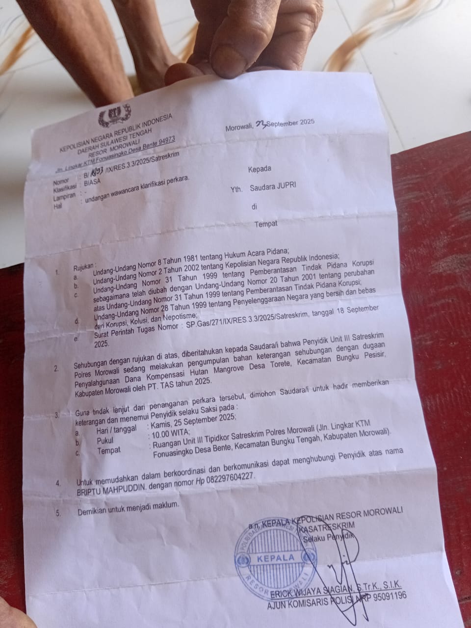 Keterangan Gambar : Dokumentasi Surat Undangan Wawancara Klarifikasi Perkara dari Polres Morowali kepada Warga Pemilik Lahan Terkait Dugaan Penyalahgunaan Dana Pembebasan Lahan Mangrove Desa Torete, Kecamatan Bungku Pesisir, Kabupaten Morowali, Propinsi Sulawesi Tengah.
